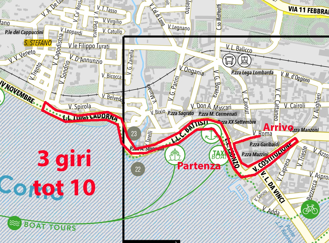 Il percorso è articolato in tre giri completi del tracciato descritto, permettendo ai partecipanti di familiarizzare con il percorso e al pubblico di seguire la gara da diversi punti strategici lungo il lungolago.